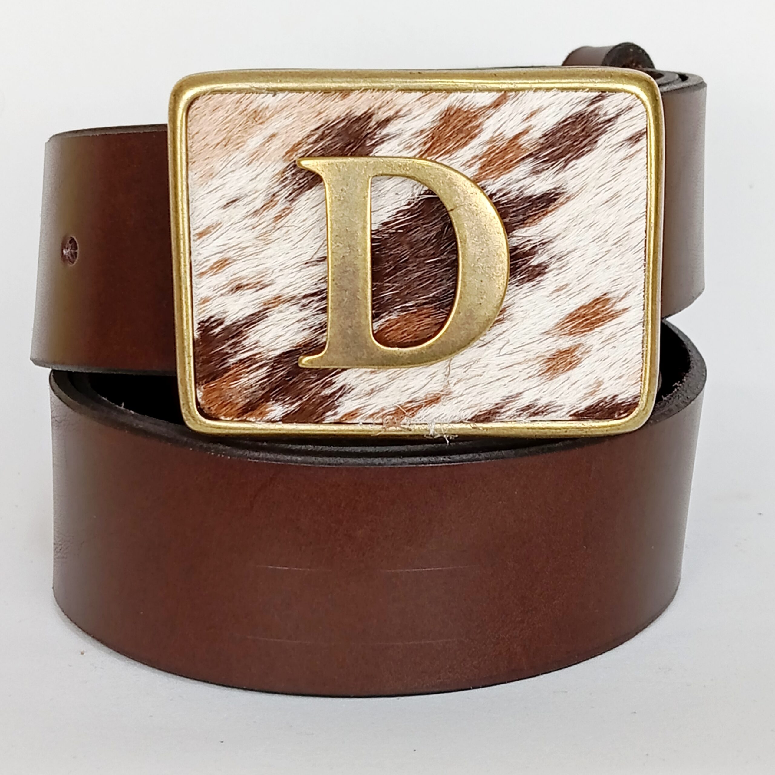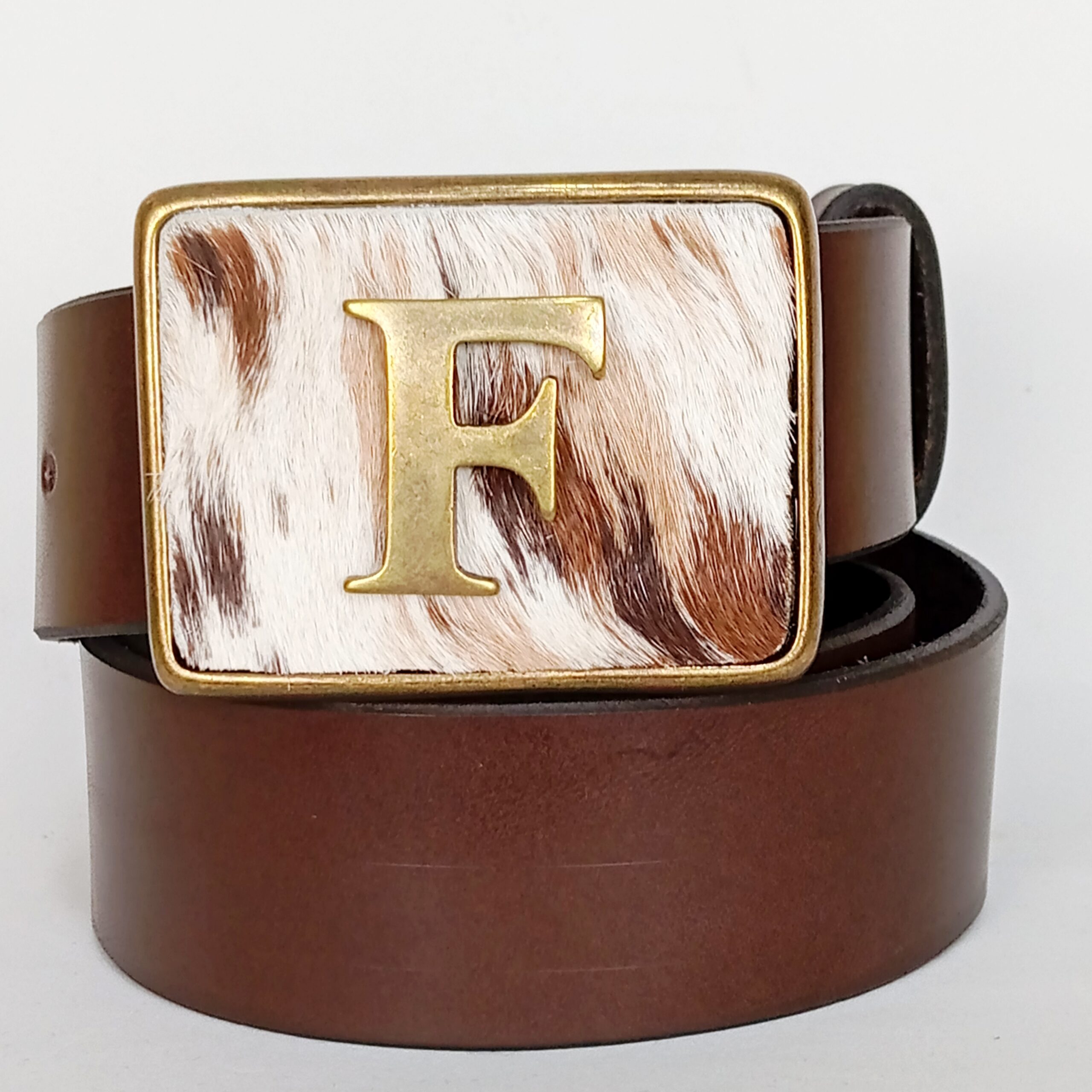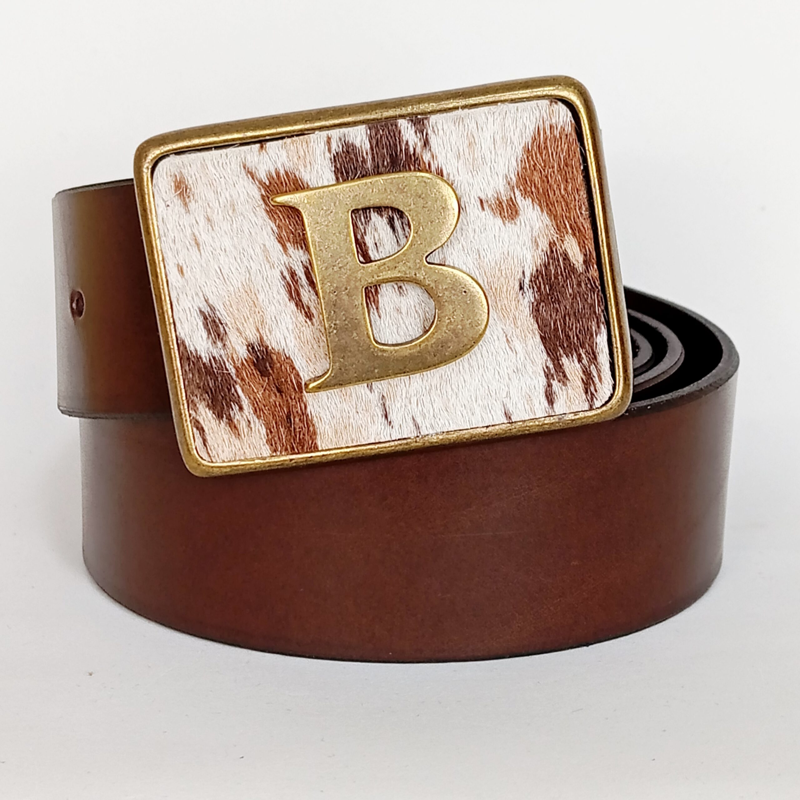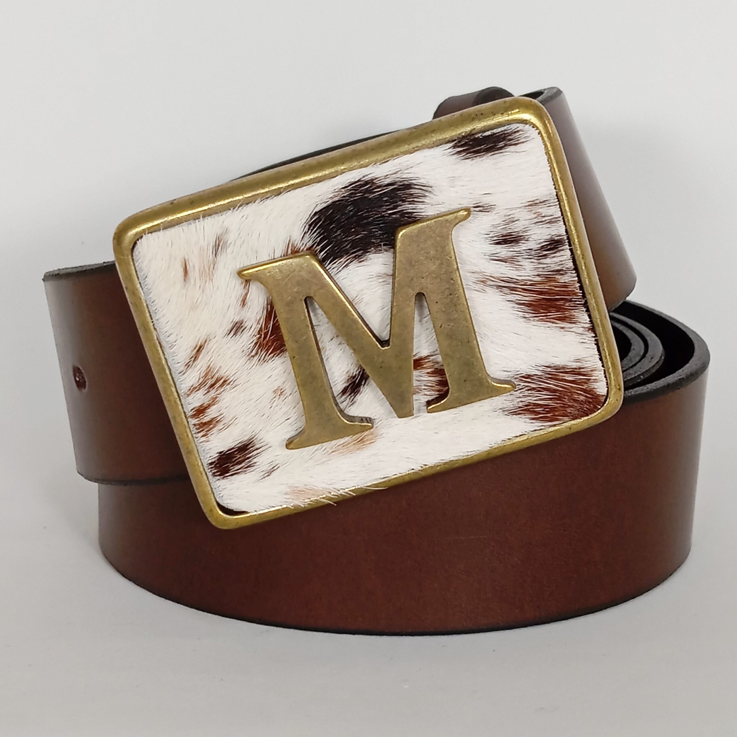 Su hebilla rectangular con borde dorado destaca por su diseño en piel de pelo natural con patron moteado, complementado por una imponente letra en relieve.