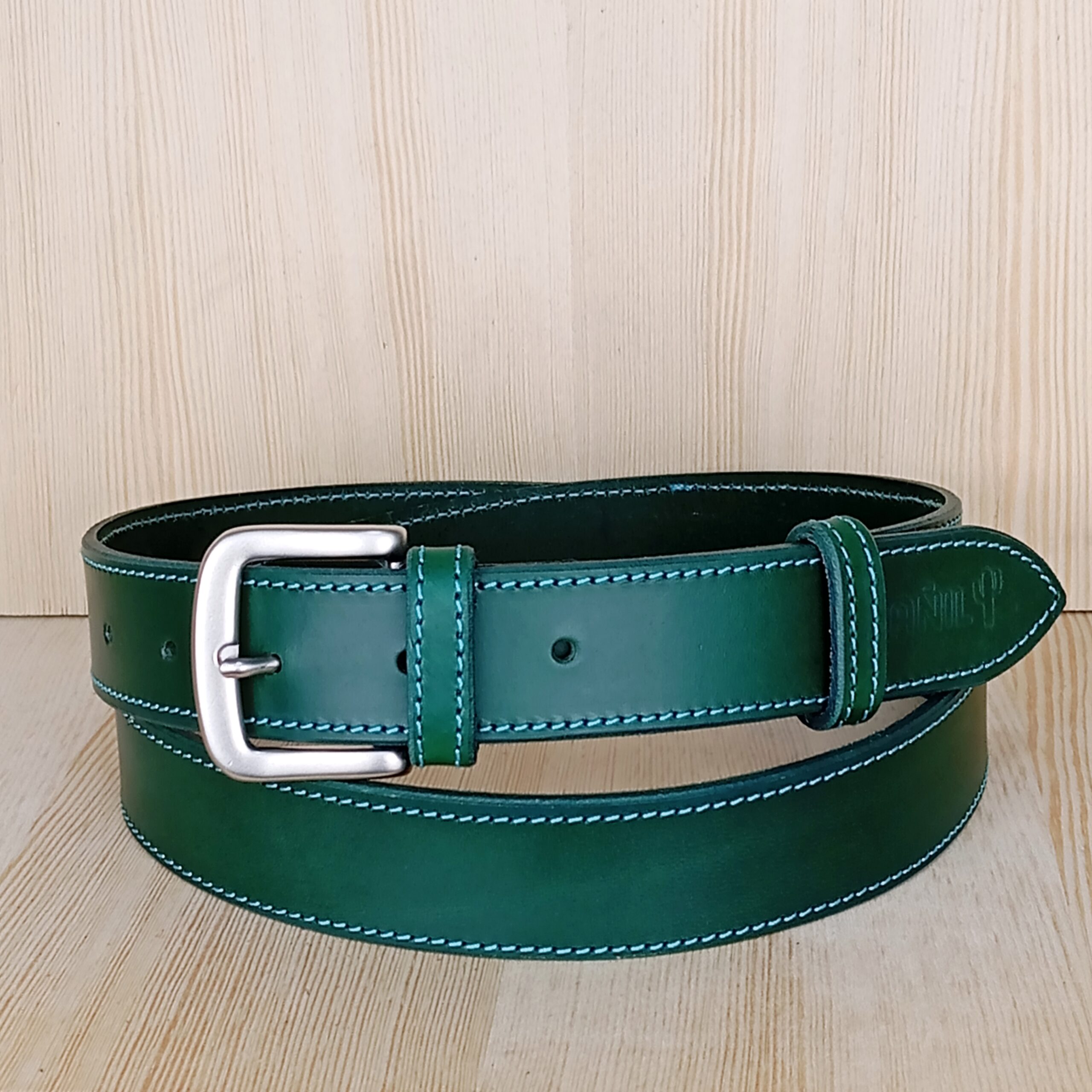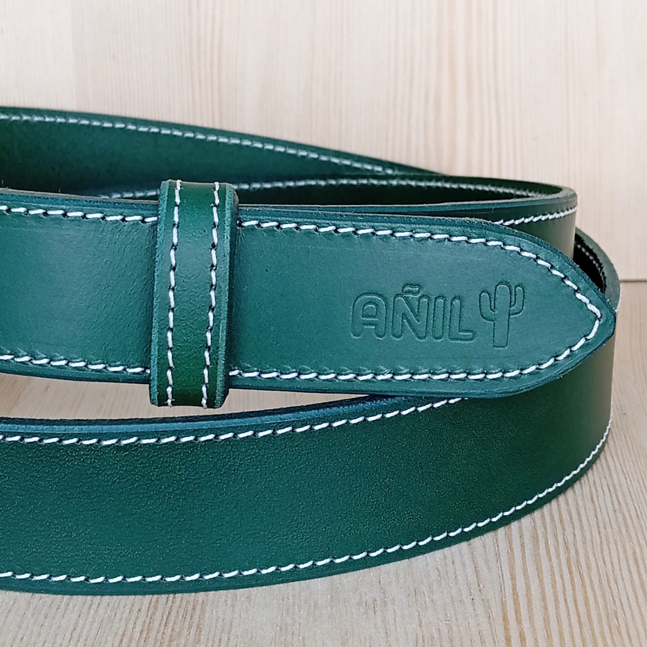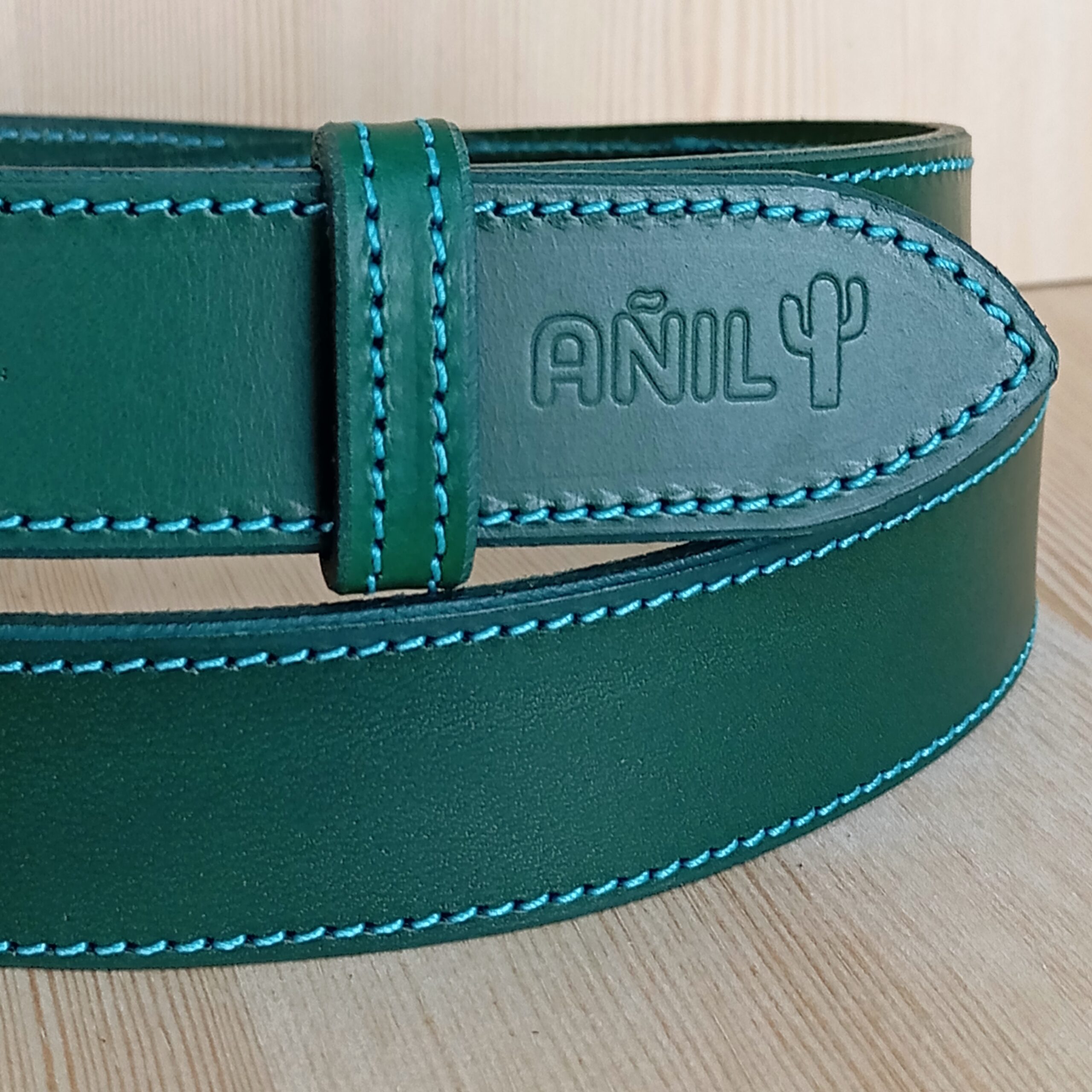 Cinturones fabricados en piel de cuello de becerro, herrajes de acero y hebillas de zamak. Tienen 35 mm de ancho, cantos teñidos, están cosidos en todo su contorno, dos trabillas y puntera terminada en punta de flecha. Podrás escoger el color del cosido entre una amplia gama para cualquiera de sus tallas.